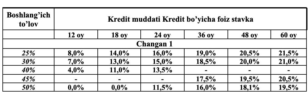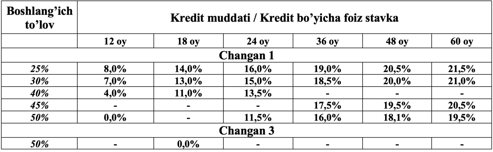 | Kredit maqsadi | Changan tomonidan ishlab chiqarilgan Deepal S07 215 MAX R19, Deepal S07 215 MAX R20, Deepal SL03 220 MAX SPORT, Deepal G318, Nevo A07 Mishlen, Avatr 06, Avatr 07, Avatr 12, Changna XK, Star truck Plus 1.6, Shenqi T30(tip ICE), Shenqi T30(tip CNG), Ruixing M60 avtotransport vositalarini birlamchi bozordan sotib olish uchun avtokredit.avtotransport vositalarini birlamchi bozordan sotib olish uchun avtokredit. |