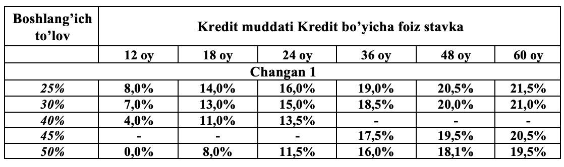 | Kredit maqsadi | Changan tomonidan ishlab chiqarilgan Deepal S07 215 MAX R19, Deepal S07 215 MAX R20, Deepal SL03 220 MAX SPORT, Deepal G318, Nevo A07 Mishlen, Avatr 06, Avatr 07, Avatr 12, Changna XK, Star truck Plus 1.6, Shenqi T30(tip ICE), Shenqi T30(tip CNG), Ruixing M60 avtotransport vositalarini birlamchi bozordan sotib olish uchun avtokredit.avtotransport vositalarini birlamchi bozordan sotib olish uchun avtokredit. |