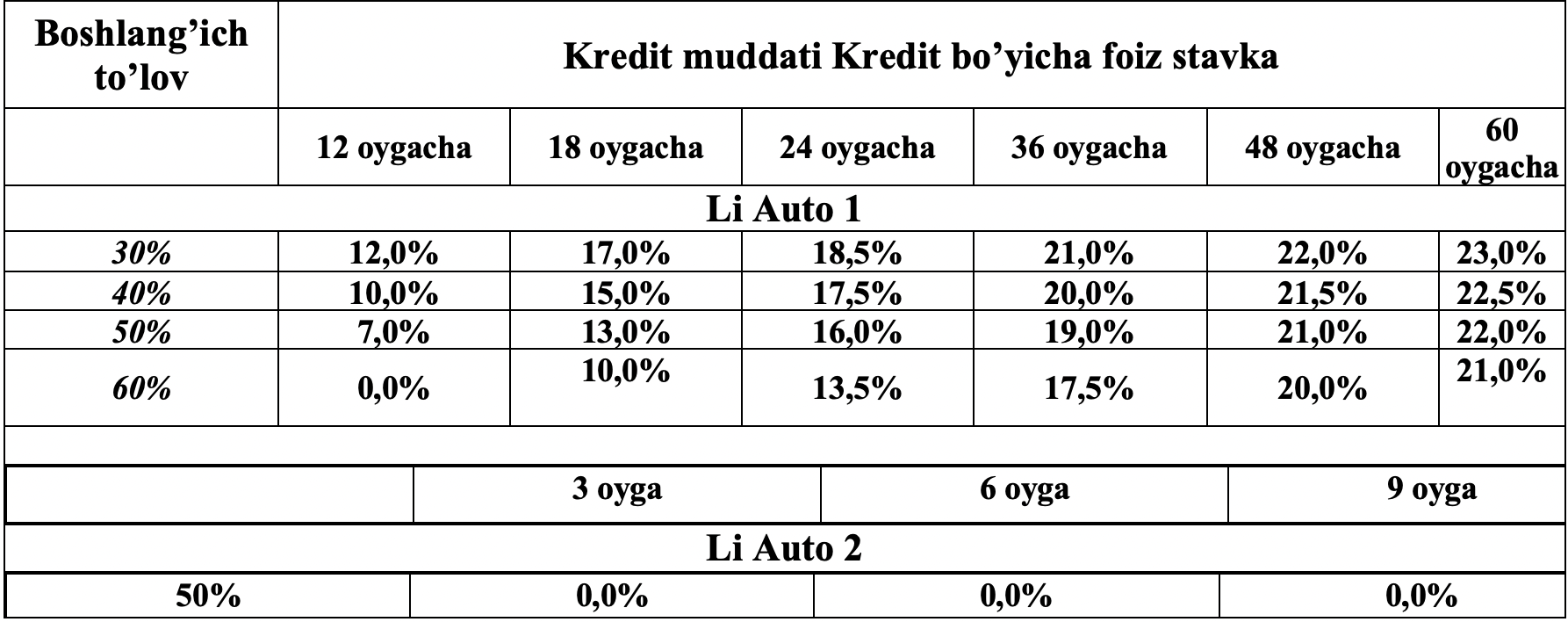 | Kredit muddati | 60 (oltmish) oygacha |