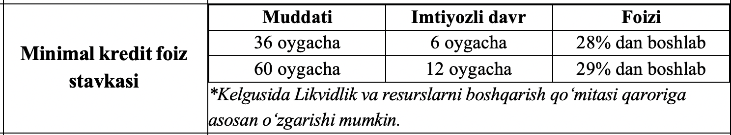 | Asosiy qarz va foiz to‘lovlari to‘lash davri  | Asosiy qarzdorlik –imtiyozli davr tugagandan so‘ng har oyda; Foiz to‘lovi - har oyda  |